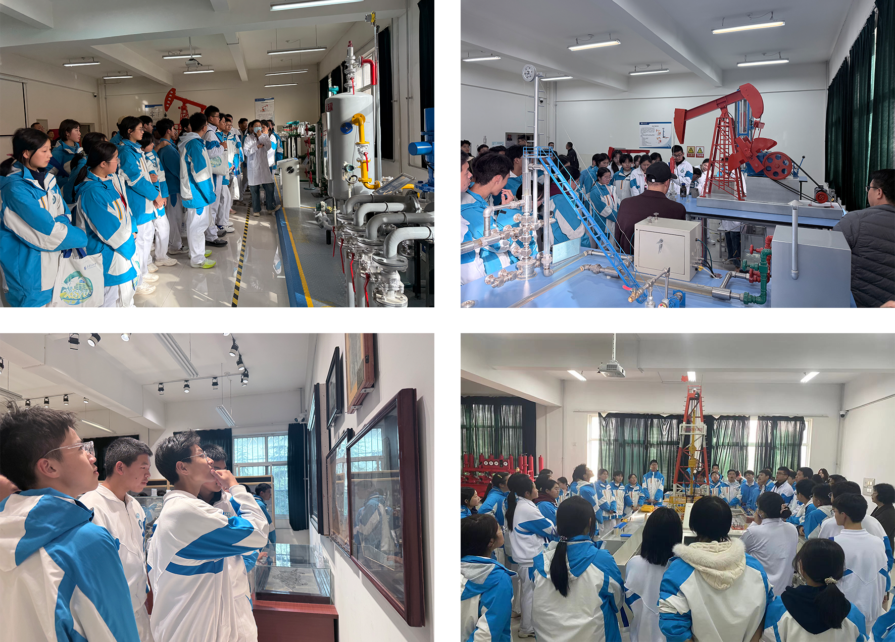 在我校陕西省石油石化科普基地,同学们依次参观了钻井实训室、地质标本实训室、采油实训室、油气分布沙盘以及集输、炼化等多个实训教学区。参观过程中,同学们认真聆听讲解,仔细观察设备演示,积极思考技术原理,并踊跃参与互动交流。通过这种直观生动的现场教学,大家对石油天然气的勘探、开发、储运和加工等全产业链环节有了初步认识,深刻感受到能源领域的广阔前景,进一步激发了在相关领域深入学习、未来在国家能源事业中实现自我价值的志向。