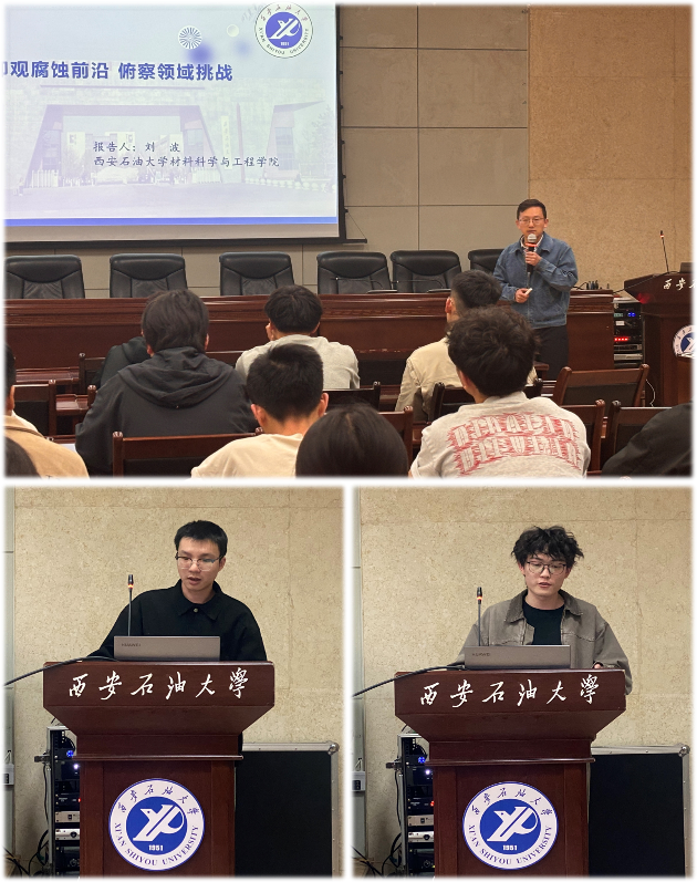 本次论坛聚焦材料腐蚀机理、金属表面强化、焊接工艺优化等方向,为师生搭建了一个思想碰撞、学术互促的高质量交流平台。学院2023级硕士研究生陈震游、王子龙分别围绕气田采出水管道冲刷腐蚀失效、堆焊Fe-Cr-C合金组织性能优化分享了科研成果。两位研究生深耕各自研究领域,成果丰硕,已发表高水平学术论文并主持研究生创新项目。刘波老师立足腐蚀学科前沿作主旨报告,精准剖析了领域内的关键挑战与发展态势,并与在场学生深入交流,为拓宽师生科研视野、明晰研究方向提供了有力指导。
